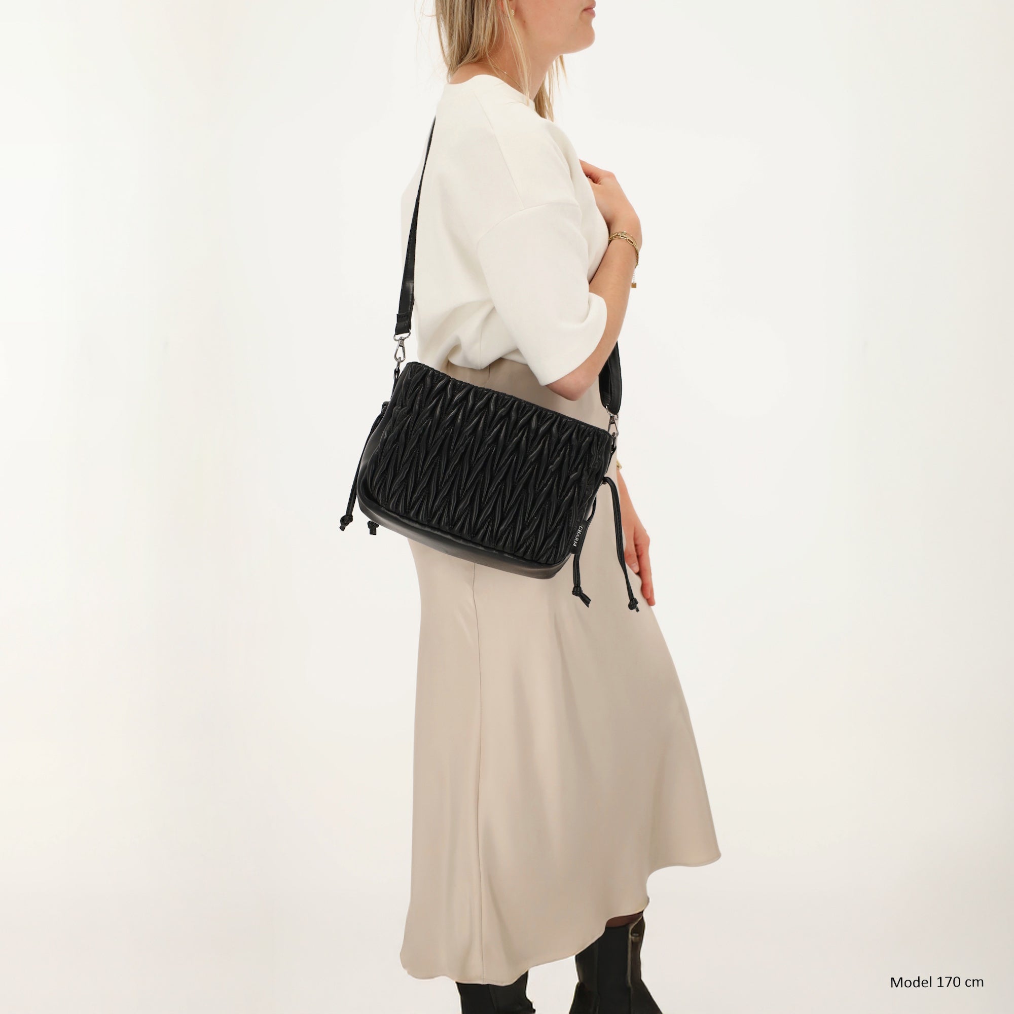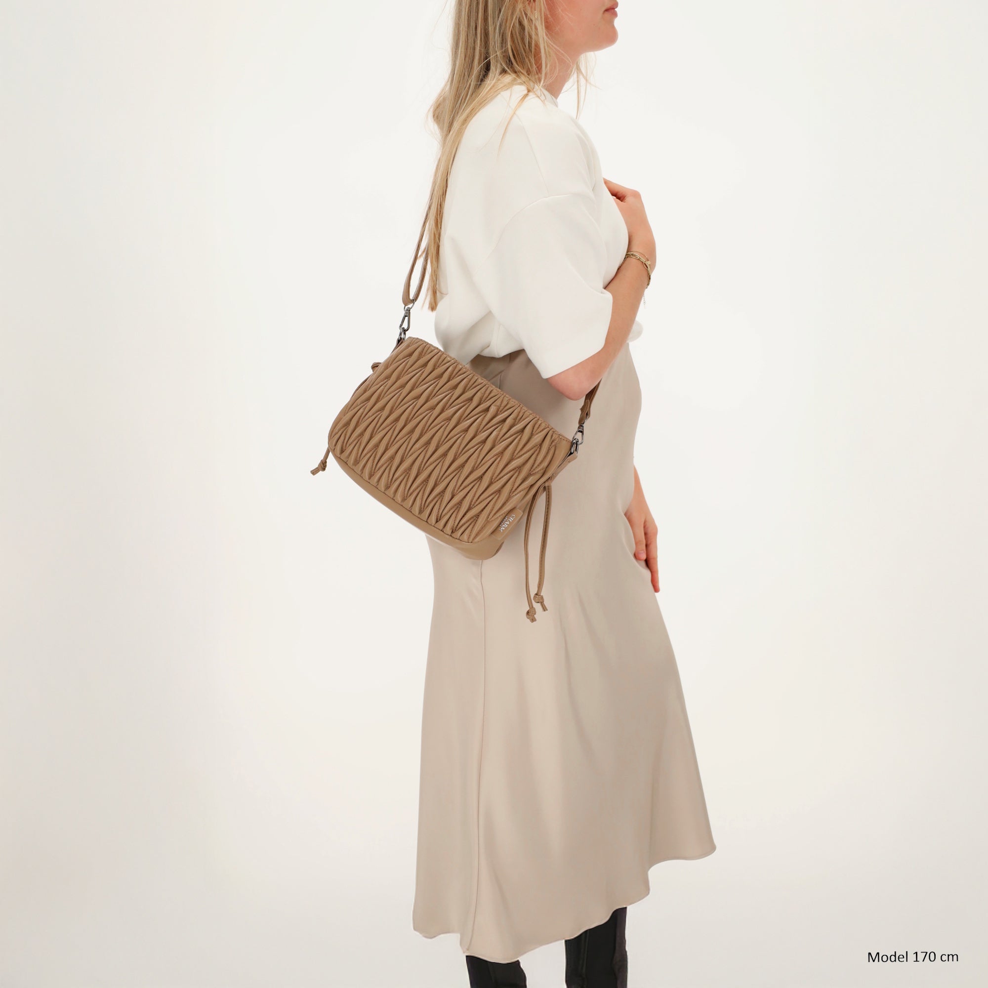 En el interior, el bolso tiene un bolsillo con cremallera y un bolsillo separado para el teléfono, para que puedas guardar tus objetos esenciales de forma clara y segura. La correa para el hombro ajustable y extraíble garantiza que puedas llevar el bolso como quieras: cruzado o cómodamente colgado del hombro.