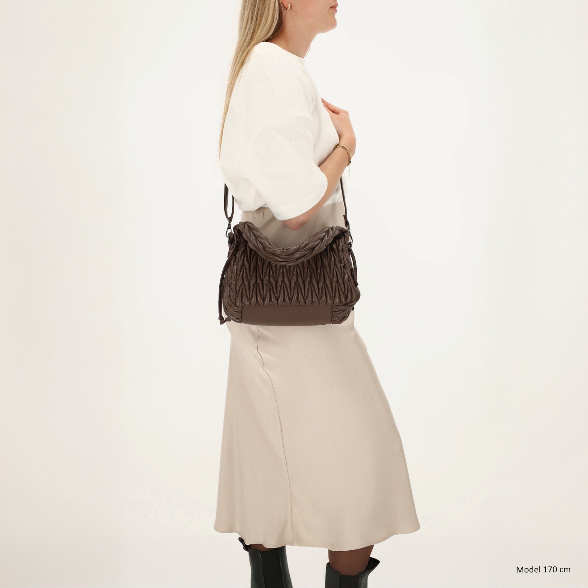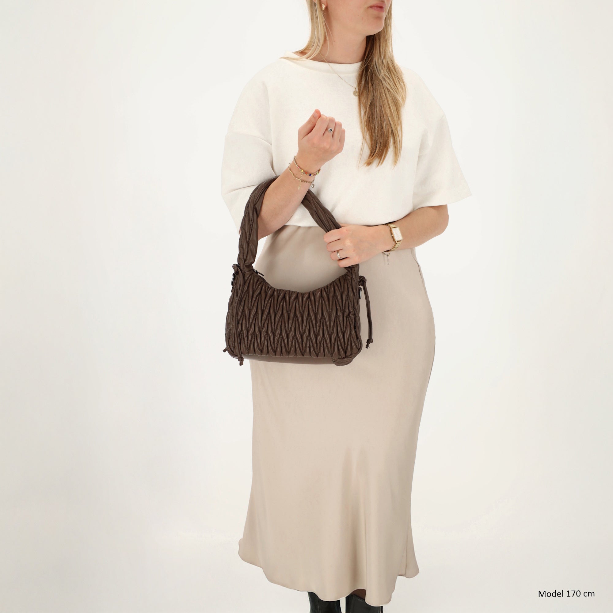 El interior está prácticamente organizado con un bolsillo con cremallera y un bolsillo separado para el teléfono, para que puedas guardar ordenadamente tus elementos esenciales. Un detalle divertido es el asa: puedes acortarla fácilmente con las cuerdas, lo que crea un efecto moderno y contemporáneo.