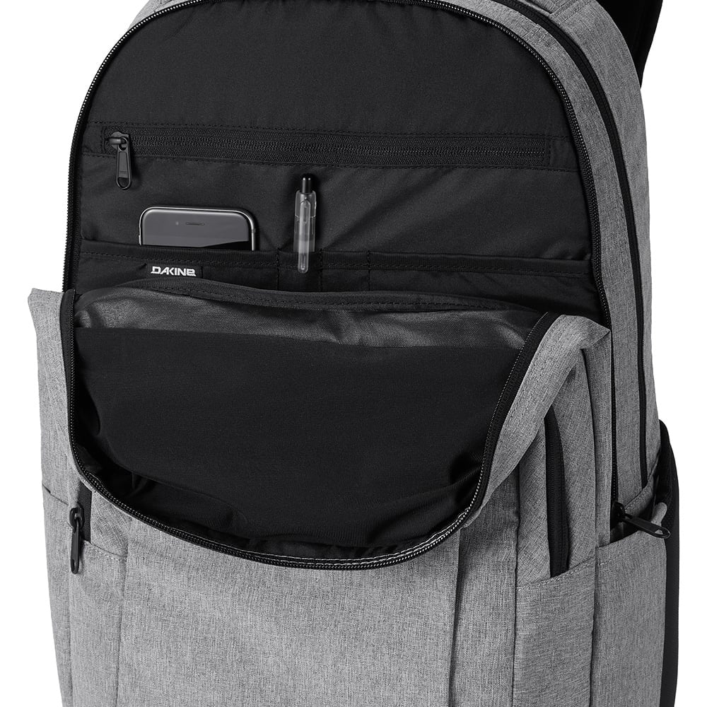 This spacious and stylish backpack, the Campus L 33L from Dakine , offers plenty of storage space and convenient organization options. The backpack is equipped with several zippered compartments and pockets for optimal organization. The two large zippered compartments can safely store a 15'' laptop and other large items. There are slip pockets on the sides of the bag that are ideal for a water bottle or umbrella. The insulated cooler pocket on the front keeps food and drinks cool all day long. In addition, a padded pocket on the top protects delicate items, such as sunglasses, from scratches. The adjustable shoulder straps ensure that the bag is comfortable to carry on your back