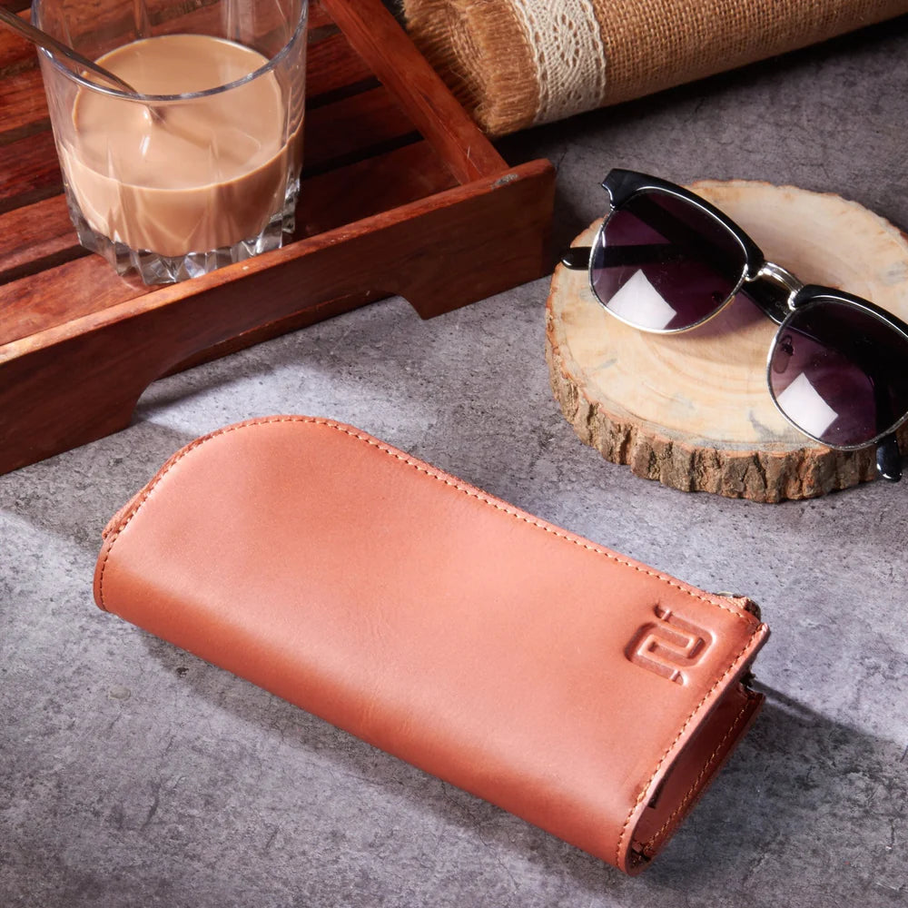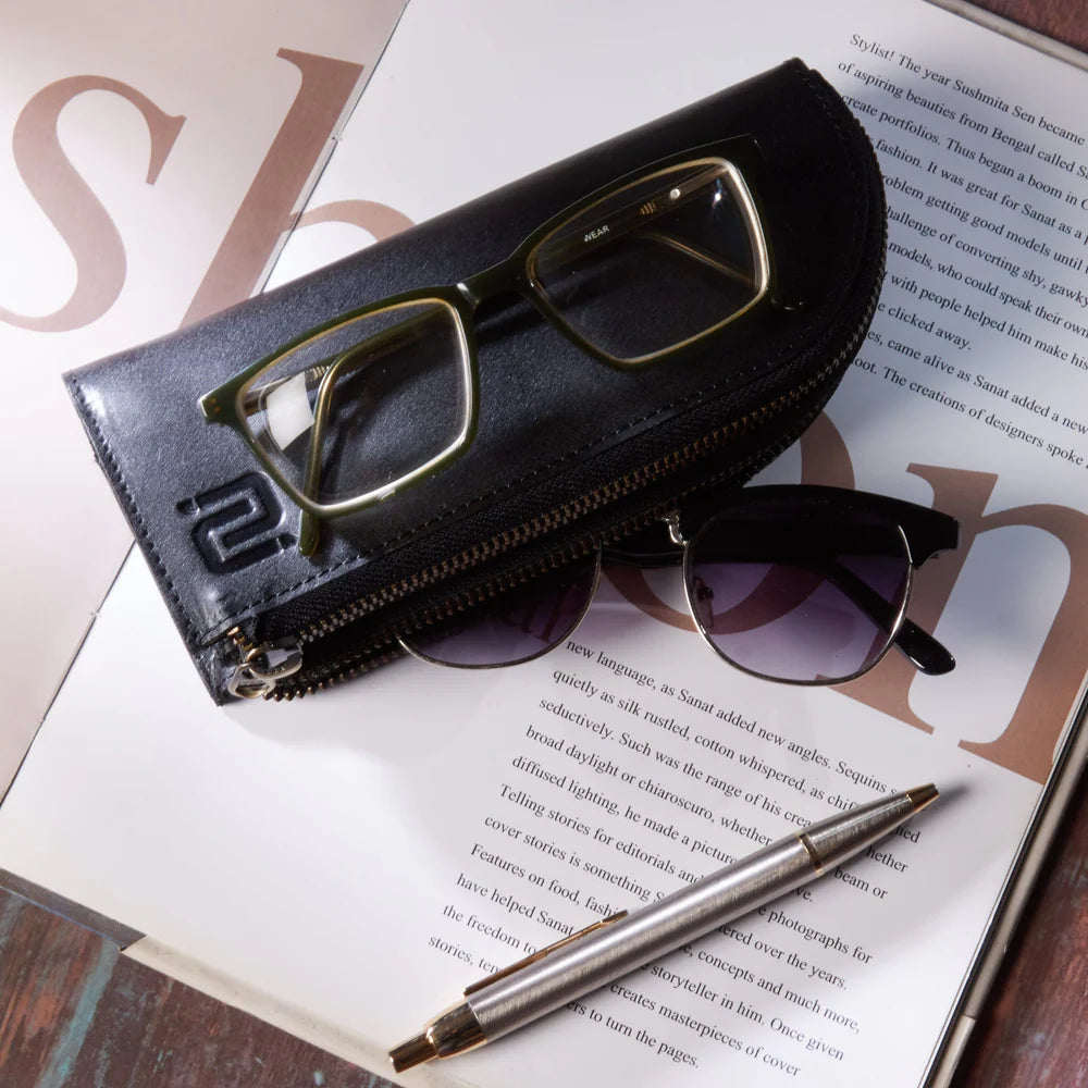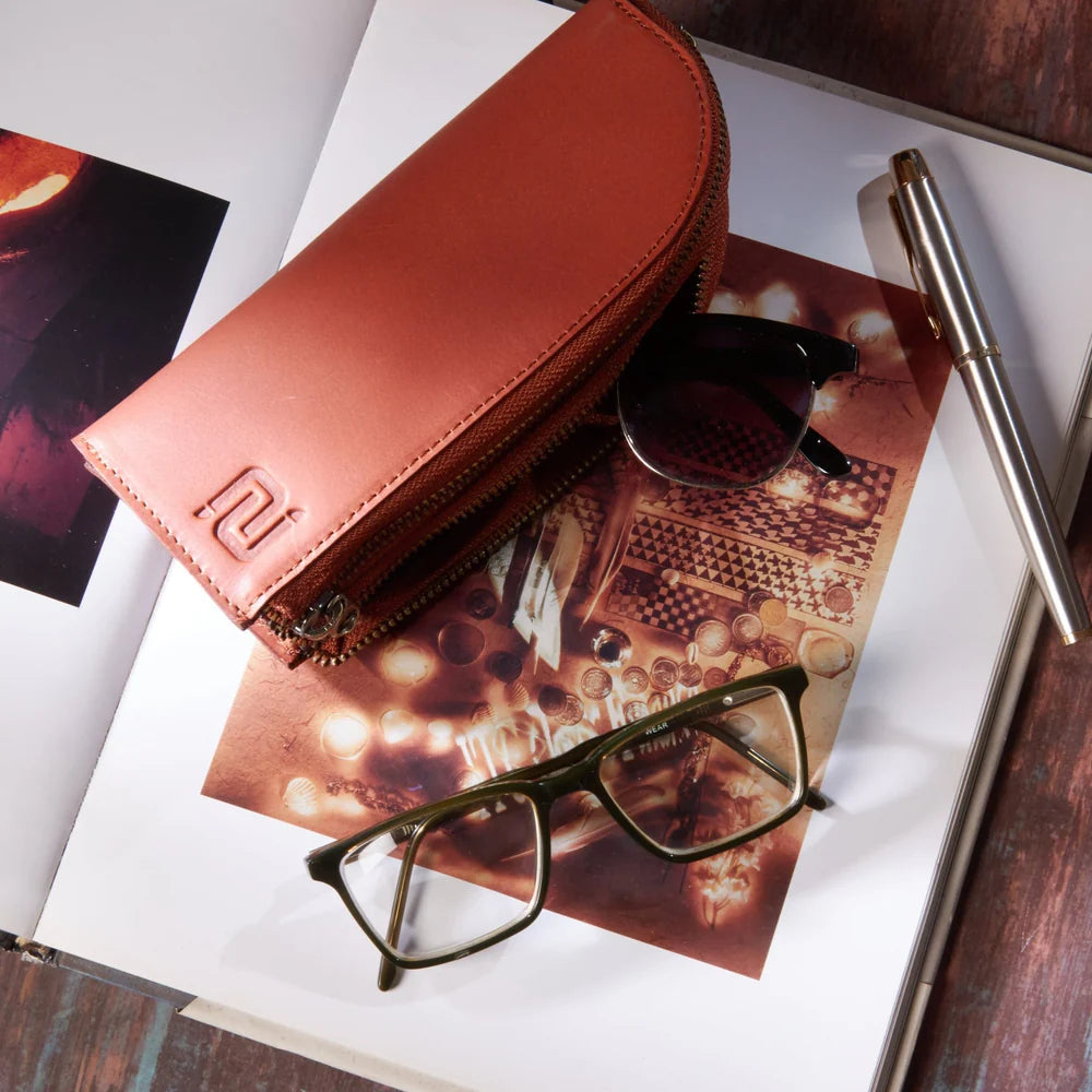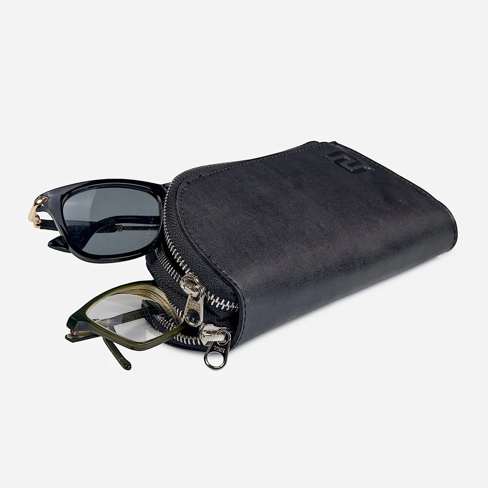 De Alpha Brillenhoes. Handgemaakt van full-grain nappaleer, elegant en stevig. Ontworpen om twee brillen compact en stijlvol te beschermen onderweg.