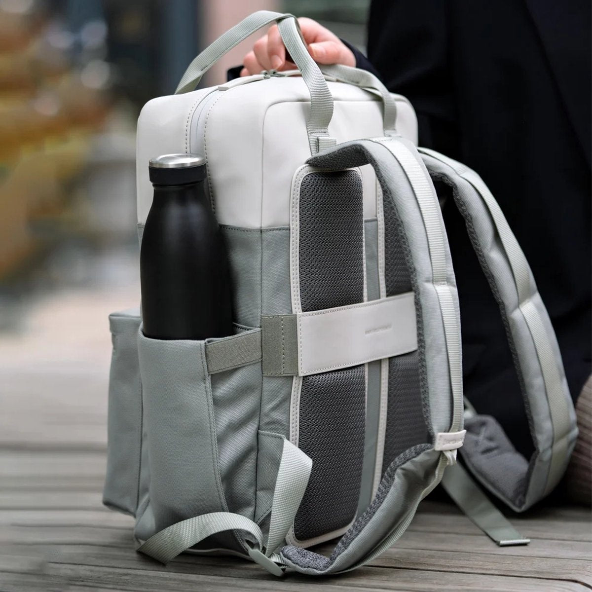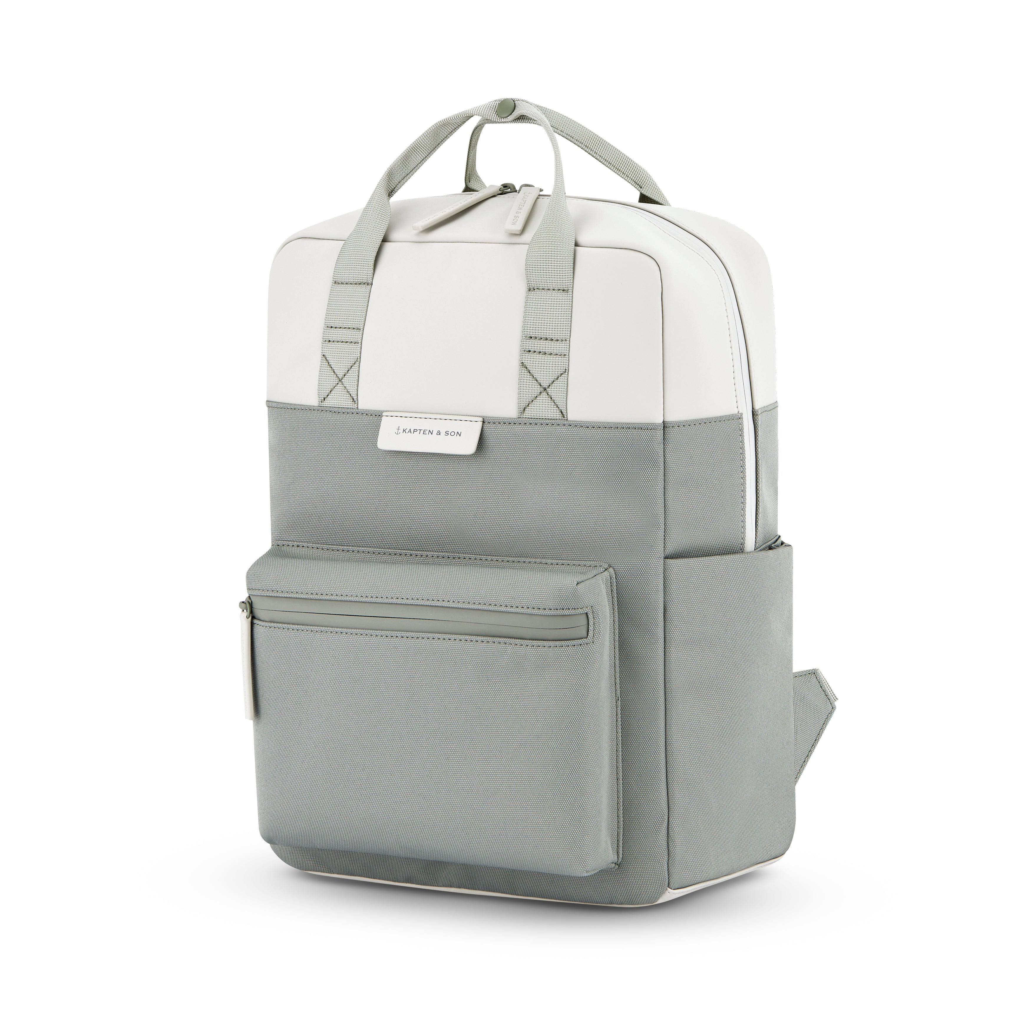Meet the next level backpack: The Bergen Pro Muted Sage offers 11 liters of storage space, complemented by a 15" laptop compartment and a tablet compartment with microfleece. Inside, you will also find a zippered pocket and two additional slip pockets. The outer zippered pocket remains, but we have also added an anti-theft pocket on the back and enlarged the side pockets. In addition, the Bergen Pro is made of a high-quality, water-repellent material mix. You can now clean the backpack even easier, because the bottom is also made of vegan tech material. For extra comfort, the shoulder straps and the back of the backpack are ergonomically shaped and padded. Speaking of the back: This model has a suitcase attachment, so that the Bergen Pro can also accompany you on longer trips. Rediscover the Kapten classic and add the Bergen Pro Muted Sage to your life!