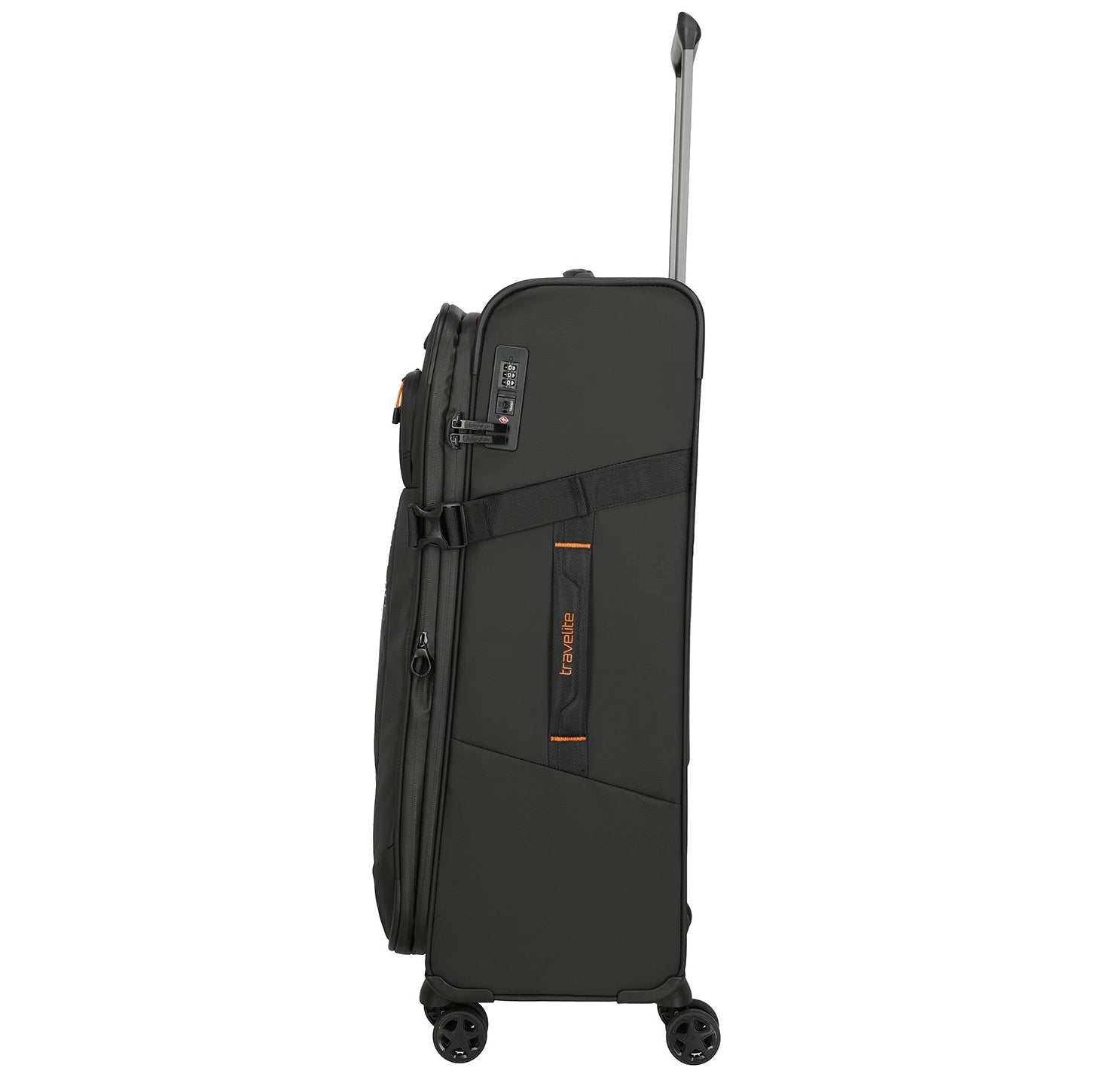 The Air Base Spinner 55 Hand Luggage Super Light by Travelite is a hard and large size hand luggage suitcase from the latest polypropylene series. The shape and colour of the suitcase ensures that the suitcase stands out and is easy to recognise. The Air Base series is a stylish, ultra light and sturdy suitcase with a large volume, equipped with a handy intermediate compartment with waterproof zipper and an integrated TSA lock.